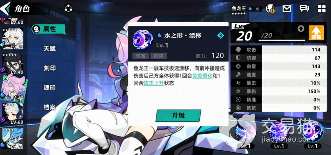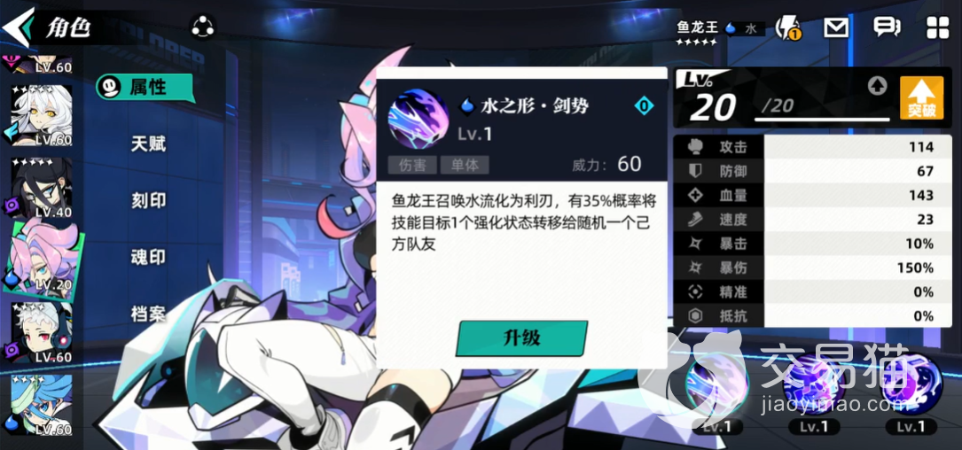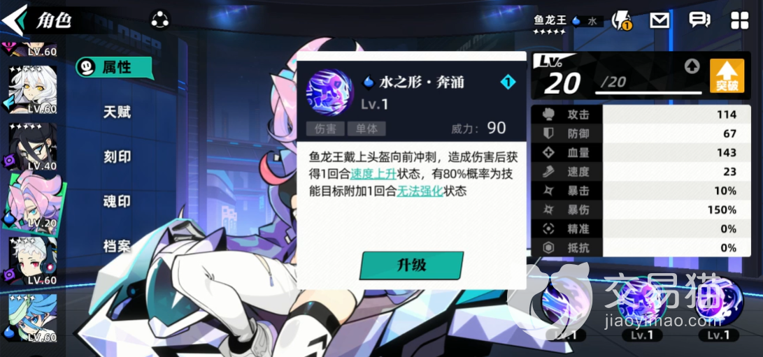鱼龙王是一个女性角色,也是水系角色中的一个,一技能是一个使用水系效果的技能,召唤出来的水会变成利刃的形状进行攻击,攻击成功有一半的几率可以让对面的强化状态转移到己方一位成员身上,要是大家想要这个几率提升的话,可以进行角色升级。