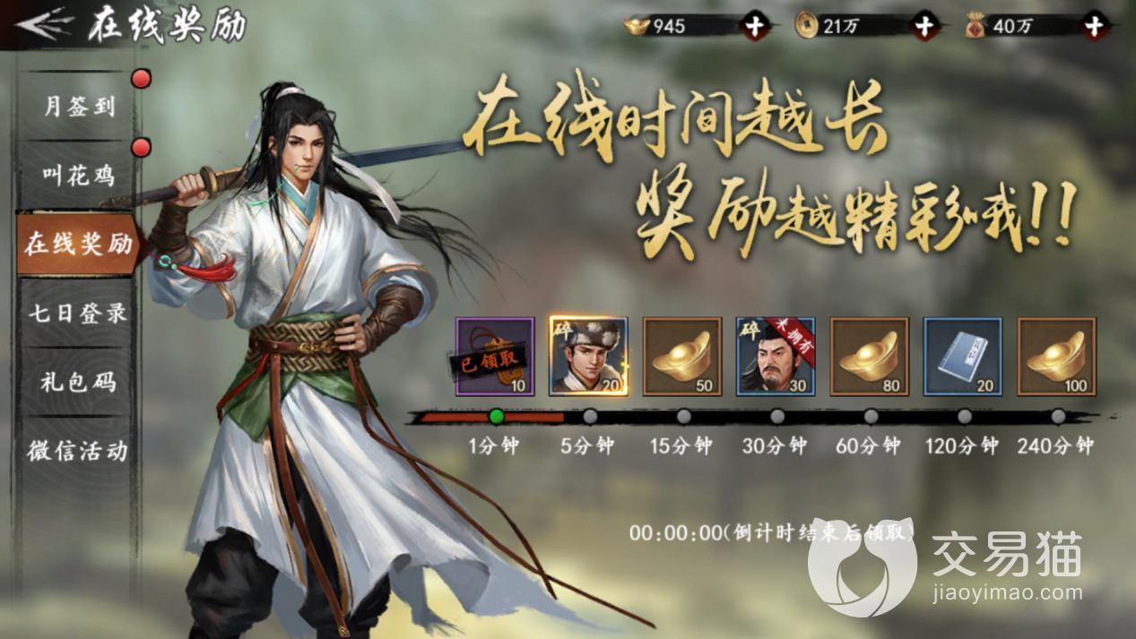3、玩家通过累积当天游戏在线时间长短,来领取各个不同等级的奖励,其中在15分钟,60分钟,240分钟阶段可以得到大量的元宝奖励。