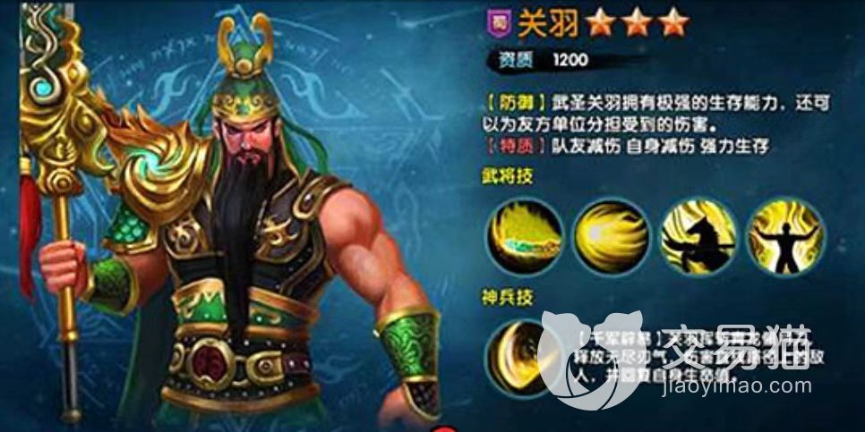 关羽也是大家比较熟悉的角色了,关羽是桃园三结义英雄中的一位,因此他在游戏中的设定比较紧靠战士,单体行动的时候,可以控制敌人,对敌人造成高伤害,但是关羽在团战的时候作用也是非常大的,由于关羽的血量比其他英雄的要厚得多,所以关羽在团战的时候在抗伤方面起的作用是非常大的,关羽的武力属性、智力属性都很高,是几乎没有短保的英雄。
