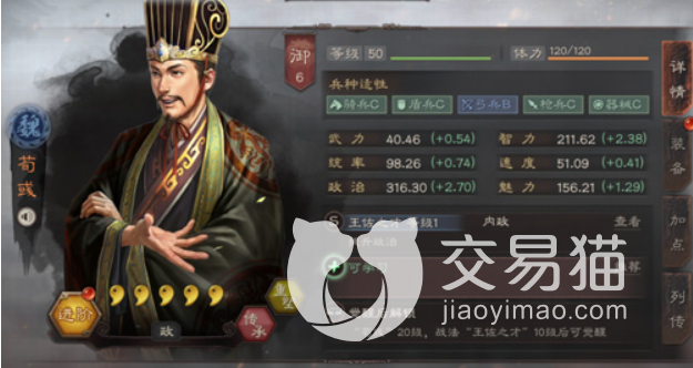 荀彧还有一个可以传承的战法叫做匡弼天下,这个战法的属性也是比较厉害的,可以为大范围我军的武将角色回复一定的血量,回复血量的多少也和荀彧本身的智力值相关,最大可以恢复百分之六十的血量,在前期的对战当中,能够直接回复这么多的血量已经相当可观了,但是到了中后期,敌人的实力也会提升不少,在这种情况下,荀彧的治疗量就不那么够了。