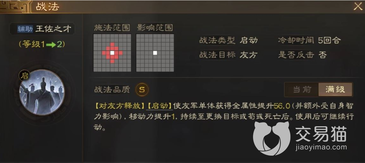 荀彧自带的战法叫做王佐之才,这个战法属于主动技能,也就是说,只能通过主动释放才能触发这个战法的其他属性,王佐之才主要是在对局当中给自己队伍中的任意一个武将角色,全部属性都提升一定数值,但是需要注意的是,每回合只能触发一次,并且提升数值的大小和荀彧自身的智力数值挂钩,小编认为这个战法在对局中还是比较重要的,如果在没有更好的增益效果之前,用荀彧过渡也是不错的选择。