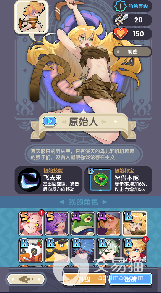 第四个推荐的是原始人,他的级别虽然处于B级,但是他的技能飞去来真的很好用,让出回旋镖,可以快速攻击敌人的同时并反向移动。后期可以把此技能放大,可以看到周边的敌人被飞镖攻击的片甲不留,他通过秘宝可以提升自身的暴击率和攻击力。
