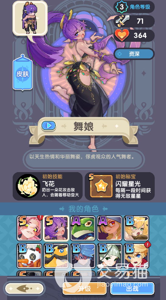 第二个推荐的S级英雄是舞娘,他可以在每日登录的奖励中领取,初始技能是飞花,随着不断的移动不断变大,能力非常强,可以让敌人产生减速的同时达到攻击效果,只要敌人在花的范围内,都会受到一定伤害。另外在场景挑战中,会每隔一段时间,出现星星加速技能,为角色带来无敌状态,关键时刻可以快速逃离敌人攻击范围。