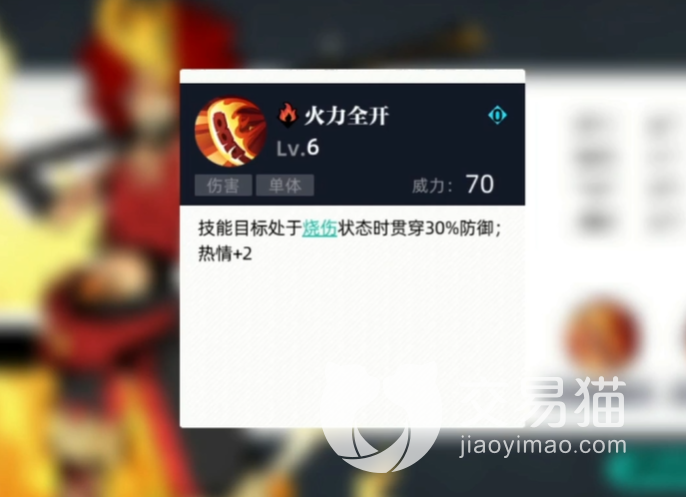 一技能火力全开就可以帮助大家在游戏中进行单体伤害,释放这个技能的时候要看对面有没有进入烧伤的状态,要是正处于烧伤的状态,就可以击破对面30%的防御,热情数值也会加2点,所以需要搭配一个带来烧伤效果的技能使用。