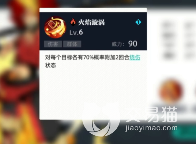 二技能是火焰旋涡,这个技能适合人多的时候使用,是一个群体的烧伤技能,使用的时候可以对对面被击中的目标带来持续两个回合的烧伤状态,不过这个状态是只有70%的概率可以触发的,这个技能先释放,有了烧伤状态就可以接一技能啦。