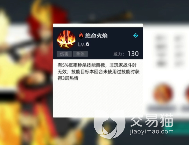 烈焰猩猩的最后一个技能就是绝命火焰,释放这个技能的时候,大家有5%的机会可以造成秒杀哦,不过对于玩家对手才生效,怪物不生效,最好是在一开局的时候就使用,因为有一个效果是如果对面受击的目标没有行动过,烈焰猩猩就可以获取三层热情哦。