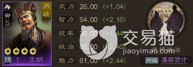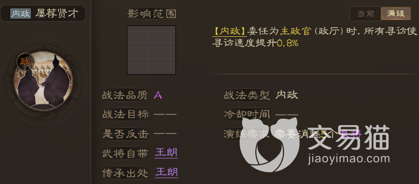 而且需要注意的是正因为它属于A级战法,所以在武将获取上也变得容易了很多,虽然并不能拆解,但自带它的武将是紫卡王朗,相比其他一众橙卡武将来说,他的获取门槛就要低很多,而且前期专门为内政抽橙卡,相信大多数朋友也不会觉得划算,所以用这个有着“屡荐贤才”的王朗正好。