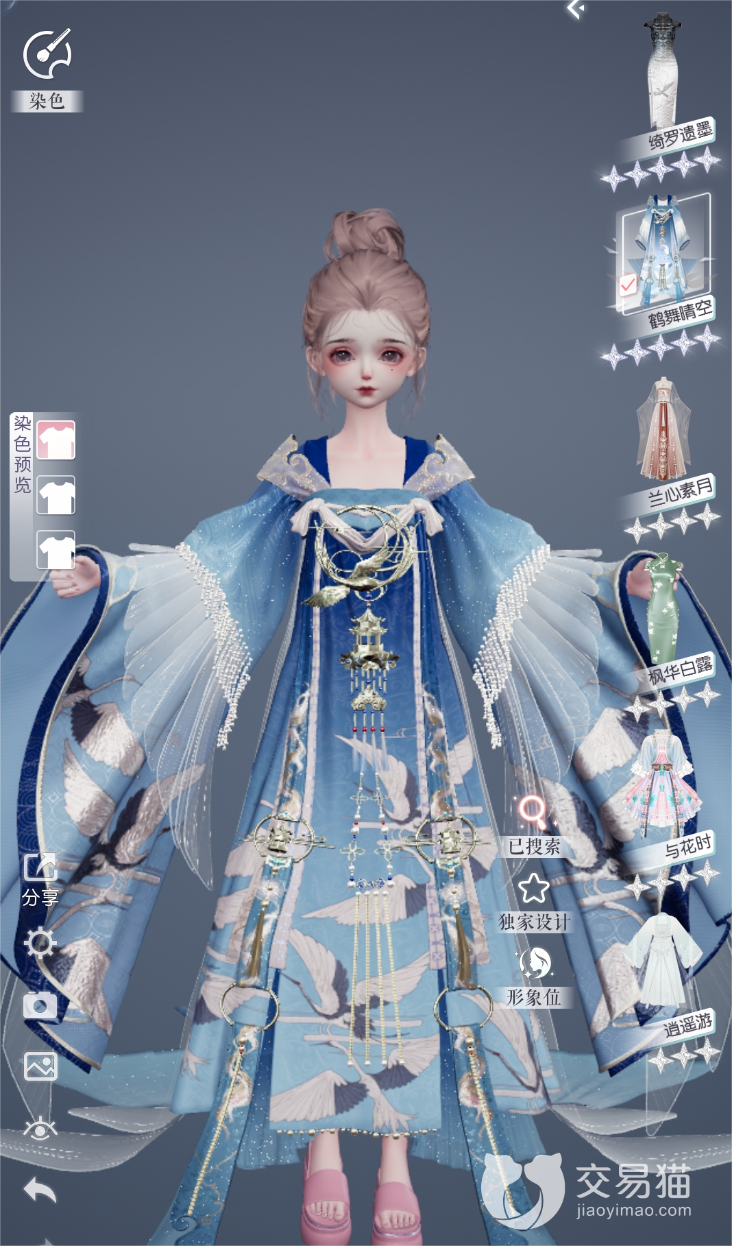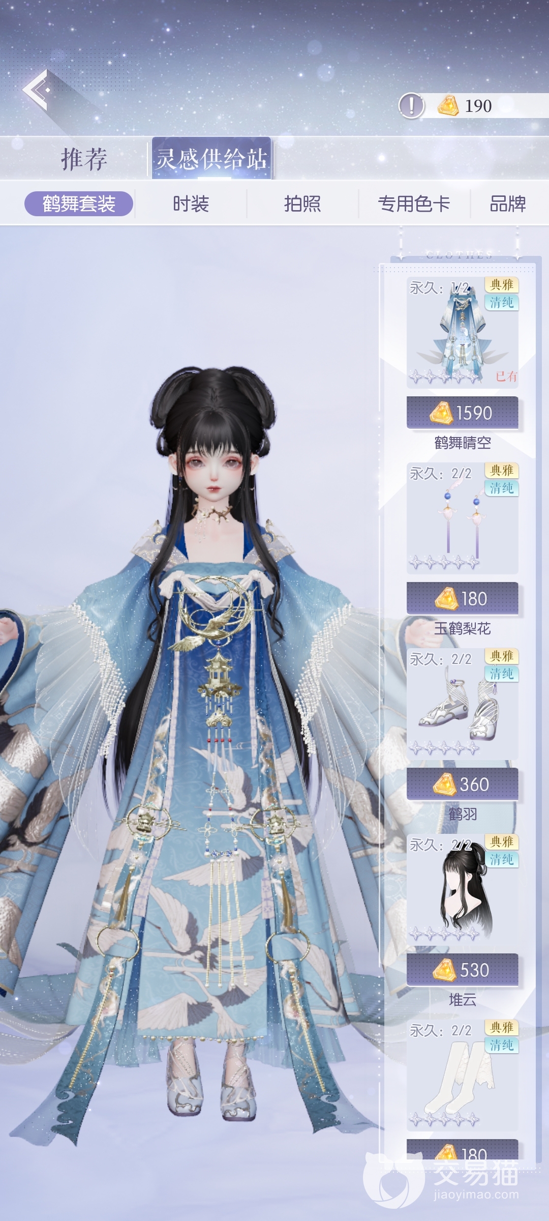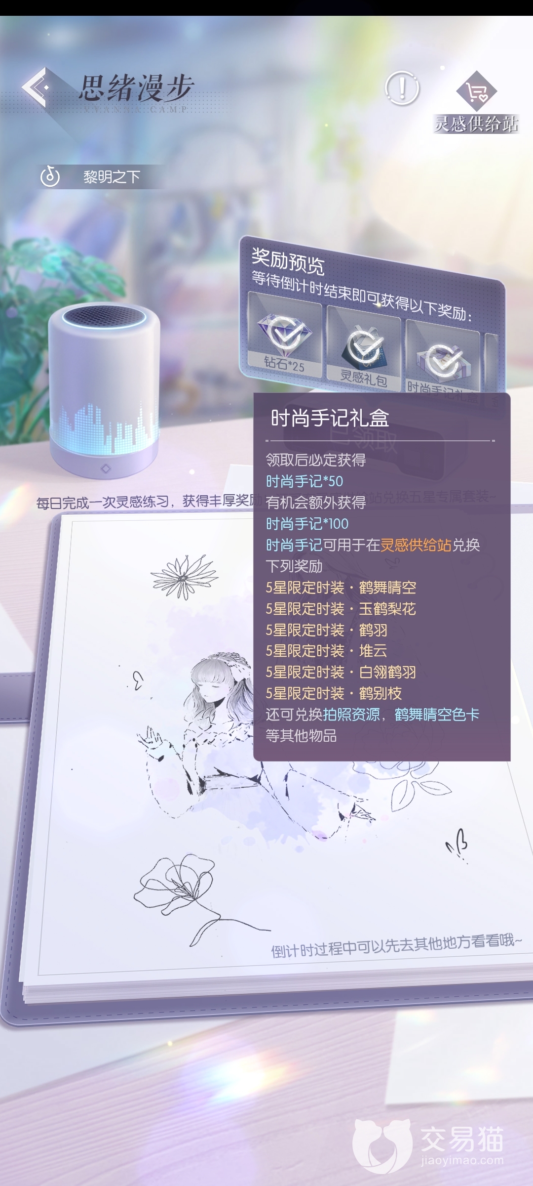 游戏内获取古风服装的方式有很多种,就比如鹤舞套装,这是一个五星的古风套,我们可以在游戏内进行“思绪漫步”的活动,然后获取时尚手记,等收集到一定数量以后,就可以来到灵感供给站进行兑换了。