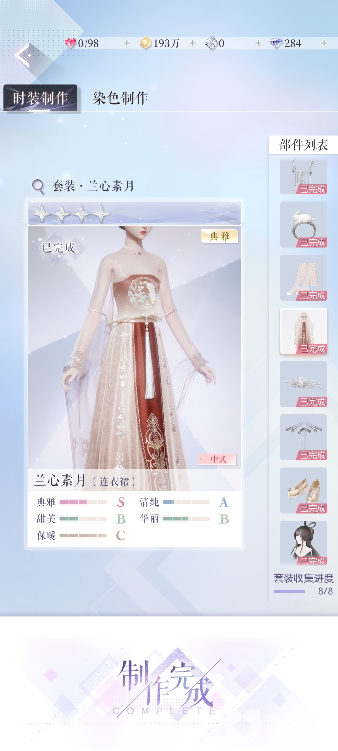 然后我们在卡池内进行抽卡也有几率获得古风类型的时装,并且除了以上的方法以外,我们还可以通过时装制作来获取,比如兰心素月这套,不过制作服装需要一定的材料,有些材料要通关一些关卡才能获取,所以玩家们可以多多通关。