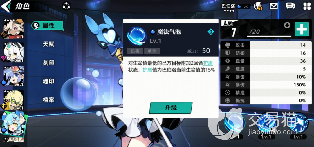 巴伯洛是一个防御型的角色,她可以给大家带来护盾保护,一技能是魔法气泡,使用的时候造成的威力是70,这是一个防御技能,使用的时候可以给己方目前生命最低的那个玩家施加两个回合的护盾,不过这个护盾值在上面是只有巴伯洛生命的15%。