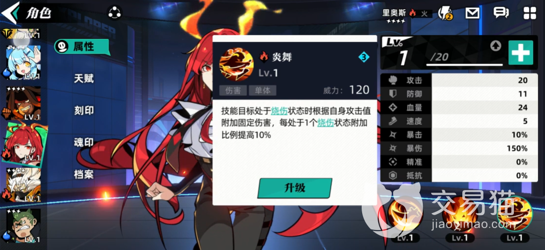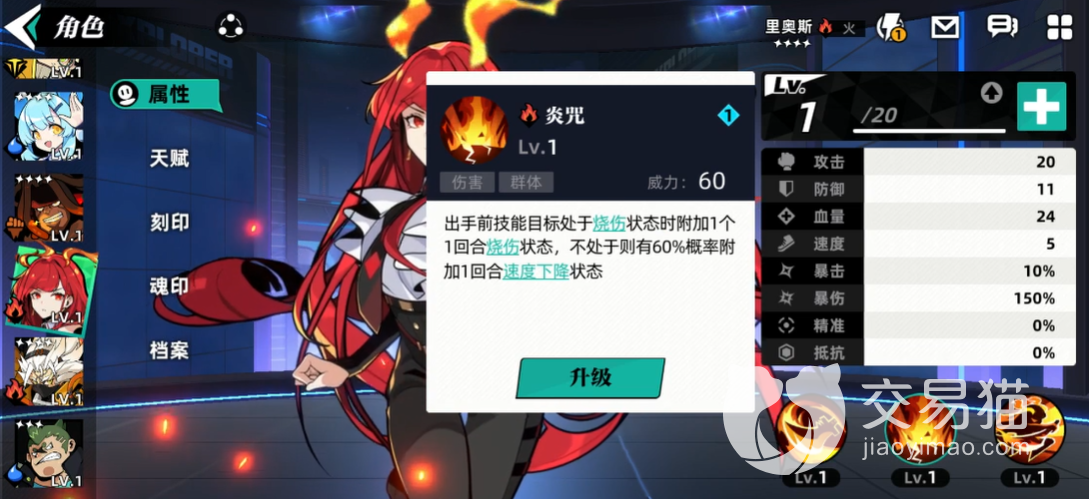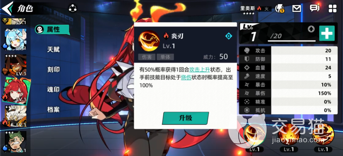 里奥斯这个角色在游戏中可以担当输出定位,因为她的技能都是火系输出技能,一技能是炎刀,使用的时候可以造成威力70,但是有机会可以触发2个回合的攻击提升状态,这个概率是70%触发的,这个时候攻击就会有百分百的机会将烧伤效果触发。