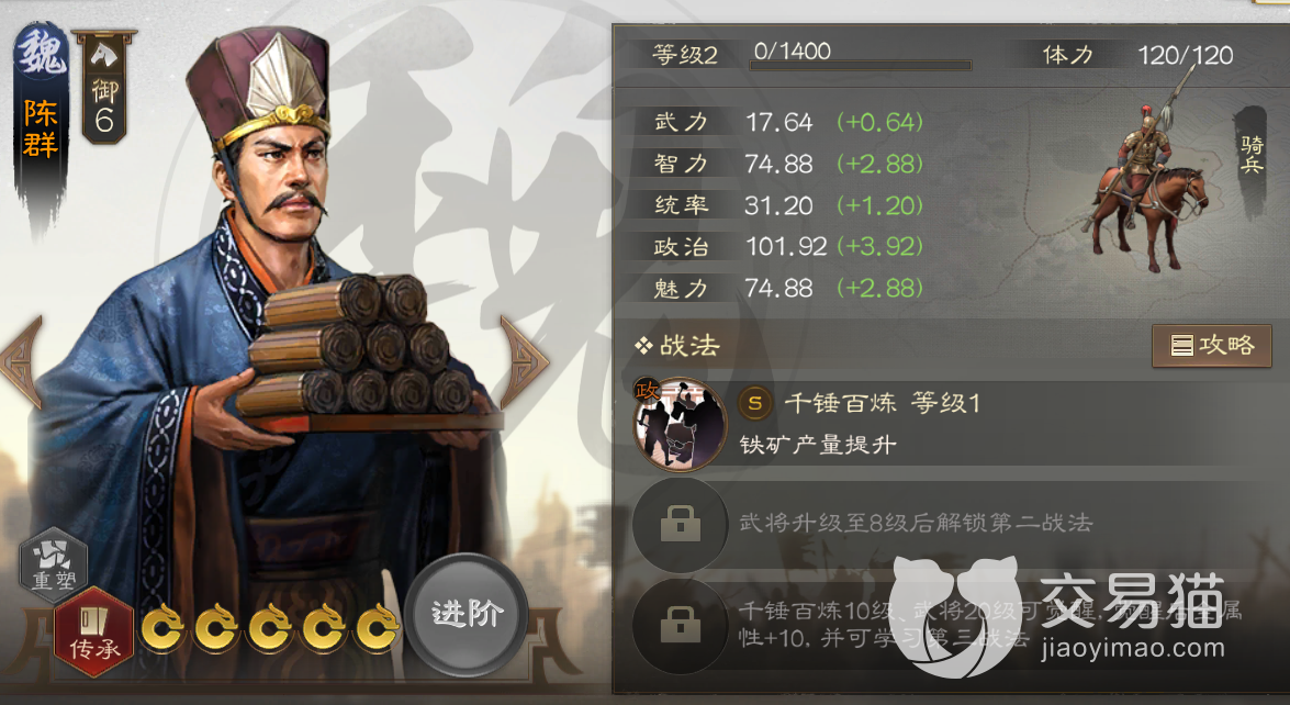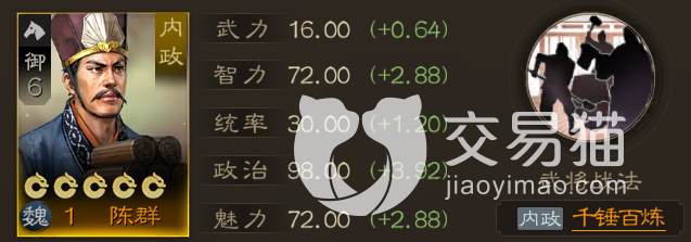 不过在适配武将方面,由于它本身并不属于能够传承的第二战法,所以只能由它的拥有着陈群自己使用,但就契合度而言,这两者还是十分搭配的,因为陈群本身就属于内政型武将,而且作为名将,它的成长政治高达3.92,到了中后期绝对是主政厅的顶梁柱,毕竟这项属性本身就是关乎全资源产量的。