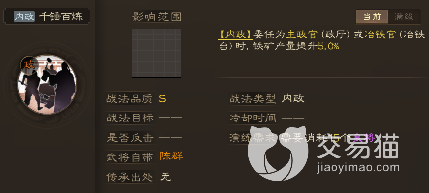 有了高政治所带来的资源产量提升,再配合它战法中提供的额外铁矿增益,玩家到了中后期铁矿也不会出现极度稀缺的情况,特别是如果能再上阵几个和陈群一样的橙色武将担任政厅官员,那么这方面的资源又将进一步提升。