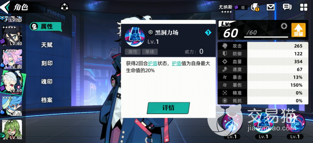 二技能是黑洞力场也是一个单体输出,有两个回合连续的护盾,不过护盾值是有变化的,根据目前尤纳斯的单体生命值设定,两个回合中每一个回合的护盾值都是目前尤纳斯最大血量的20%,这样的护盾不算高,但是基础用用是可以的。
