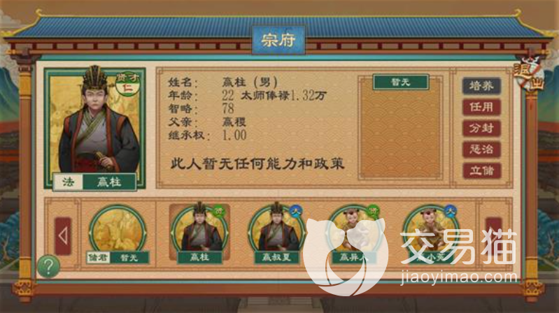 大家前期获取了子嗣之后,可以培养这些子嗣的属性,不仅是在年龄上面会增长,在智力、能力以及继承权等等方面,大家都需要关注,后期子嗣的年龄大了以后,大家就需要选定继承人,不是继承人的子嗣自然就是诸侯。
