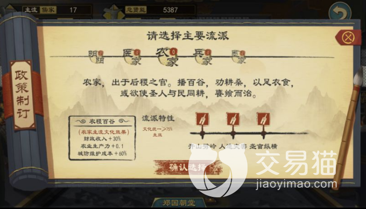 最后就是政策,因为每一个流派的政策都不一样,建议大家选择的是儒家,这样的话,兼并其他国家的时候出现付过叛乱 机会才会减少,或者是大家还可以削封效果,这是外交的玩法,不过这一点需要大家将儒家政策点满才可以。