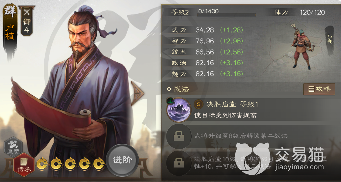 由于这个战法是卢植自带战法,无法进行传承,所以还需要结合他本身的属性来进行评析,增伤这点是固定的,没法增益,但考虑到满级有足足16%的数值,所以即便不增益,对于己方队伍的输出提升也已经很直观了。然后伤害方面则是可以受到卢植的智力增益,可以看到卢植的成长智力达到了2.96,这个数值对比紫卡已经很高,但对比橙卡的话还是差了一些,不过光用于前期也足够了。