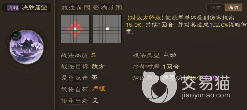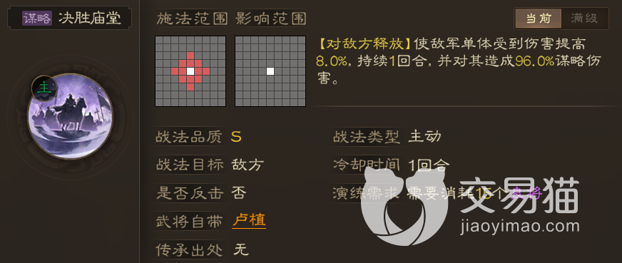 该战法本身属于S级战法,初始效果是让单体敌军受到的伤害提升8%,虽然只持续一回合,但在这之后还可以直接对其造成96%的谋略伤害,而且这两种效果都是可以通过升级战法进行提升的,达到满级之后,单体增伤最多可达到16%,而谋略伤害则能够来到192%的程度。