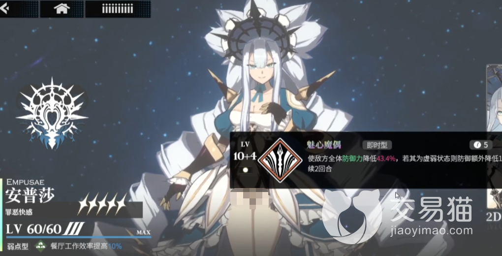 第二张受难星痕叫做安普莎,同样是五星星痕,她的数值面板加成和昔莱差不多,只有效果上有较大区别,首先是她的第一个效果,她可以让装备她的角色获得弱点攻击的能力,每次攻击都会造成额外的伤害并且降低敌方的防御,另她华能让敌方的全体防御下降,让敌方进入虚弱状态,这个效果上可以说比昔莱还要强一些。