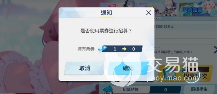这个游戏的抽卡还是比较简单的,从主界面的右下角的“招募”按钮,进入招募界面,普通的招募需消耗对应单抽券,每10次招募肯定会出1位3星的学生,如果是招募到已经拥有的学生,那么就会替换成“神名文字碎片”和对应学生的“神名文字”。