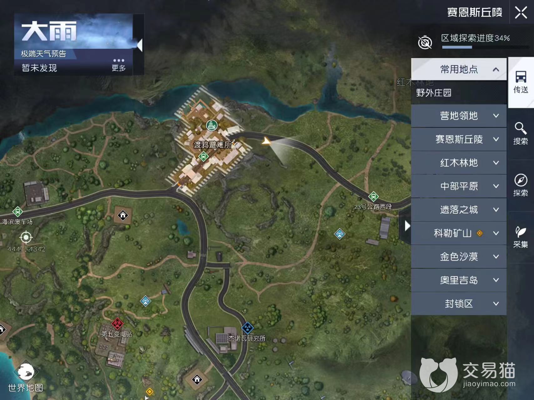 在找到鸟窝后,点击翻找即可找到海景小屋的藏宝图,拾取后会自动放置到背包中,根据图中文字反馈的信息,海景小屋的地址是在丘陵沿着海边的一个房子中,并且房子的后方就是封锁区,从世界地图中可以看到,封锁区与海有联系的地方还是在赛恩斯丘陵,埃森克化工厂区域附近。