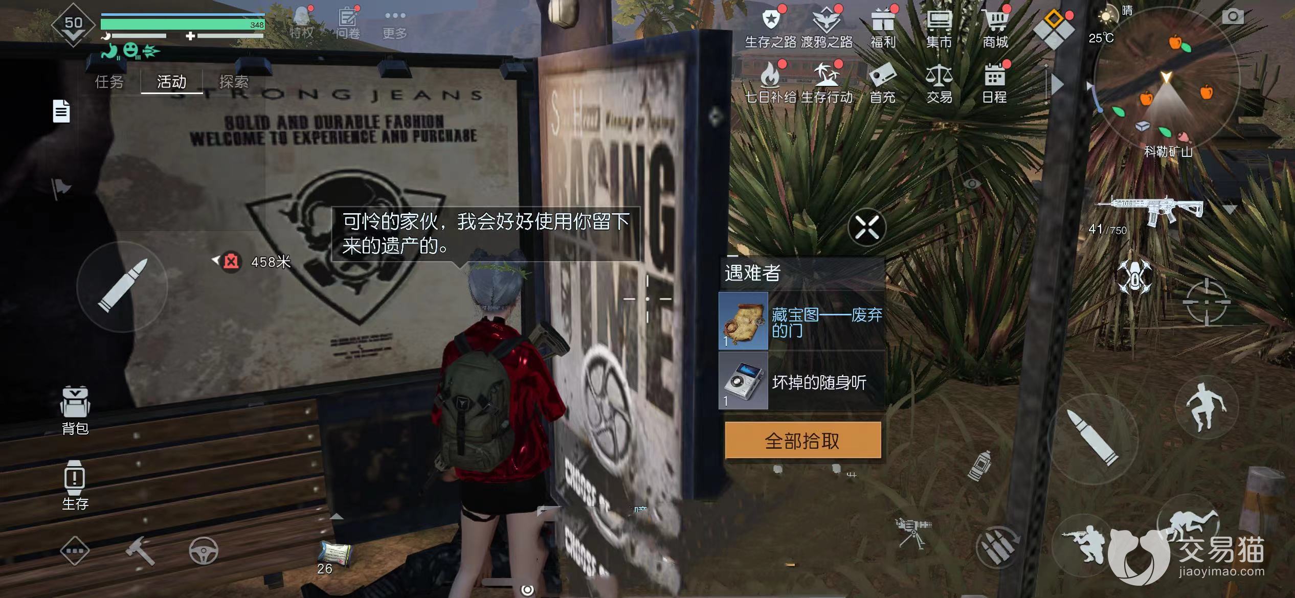 清理完变异者通过大门后,玩家需要在右侧边寻找一下,这里有一棵树,宝藏就藏在树下。这里小编给大家一个小提示,进入德雷克实验室之后会被这里的辐射影响,玩家的各种生存指标会下降,建议玩家在路途中采摘芦荟或者自带药剂和防具,以抵抗辐射带来的侵袭,优先推荐防具佩戴可长时间保持不受影响。