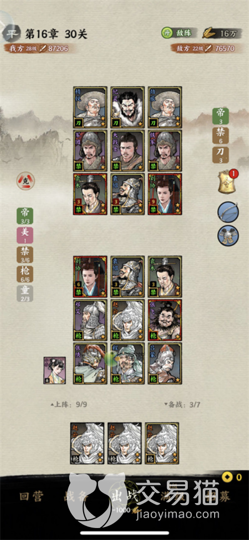 一部分人刚开始接触名将之弈,没有足够厉害的武将也没有厉害的装备,所以在名将之弈第16章通关遇到了难题,在这一章当中有多个关卡,有的比较简单,但是存在几个较难的关卡,必须通过所以的关卡才能通过第16章,了解所有的关卡设置之后,找到突破点快速通关。