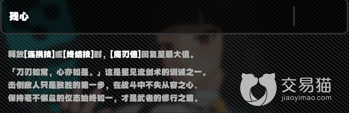 天赋第二个是残心技能,针对玩家魔刃值常常不够的情况设计的天赋,再释放e技能和大招之后可以直接回满这个数值,减少玩家游戏的时候技能特效打不满的情况,保证各位可以舒服的循环技能。