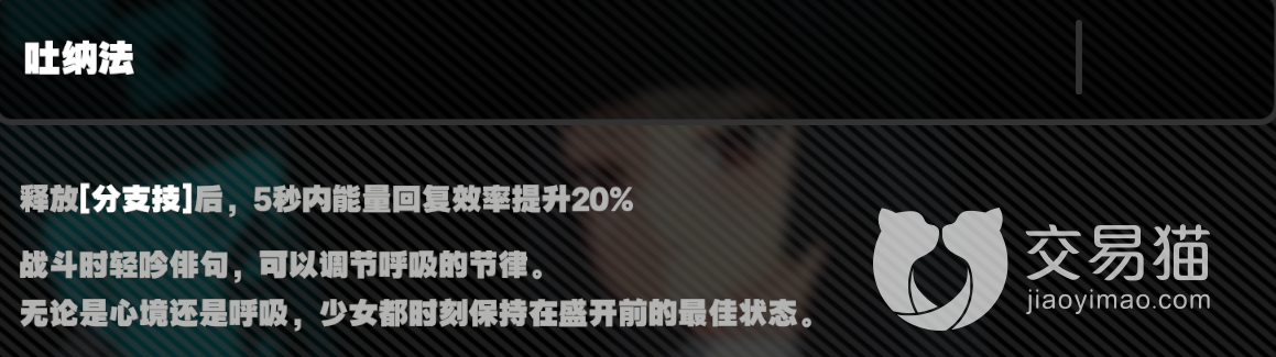 第三叫做吐纳法,也是为了角色的技能循环而设计的天赋,在放出分支技能之后的五秒时间之内为各位增加充能效率,大大加快了技能的释放速度,有了这个就能保证在充能一般的时候不卡住技能的循环。