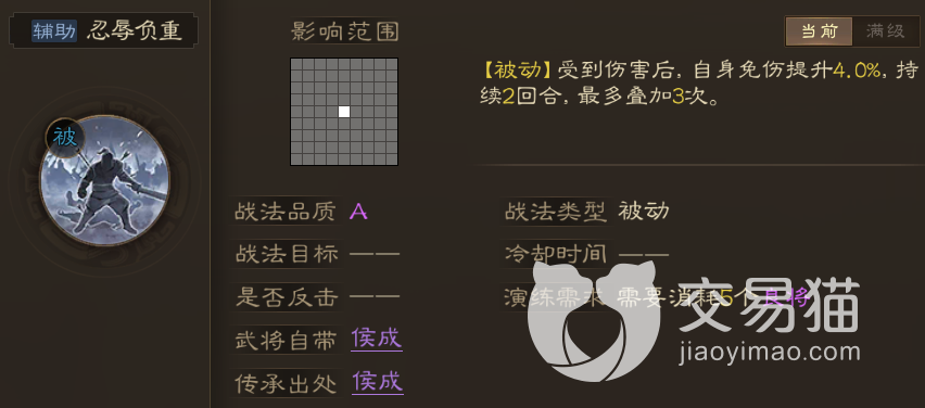 该战法的传承出处是侯成,他是一个五御值的紫卡,因此可以在卡池中较为容易的抽到,在抽橙卡的时候顺带把他抽出来即可,这个武将本身对于该战法也是比较适配的,因为他属于盾兵,需要在前排抗伤害,恰好他的统率在紫卡中也算得上不错,再加上这些免伤可以变得很能抗。