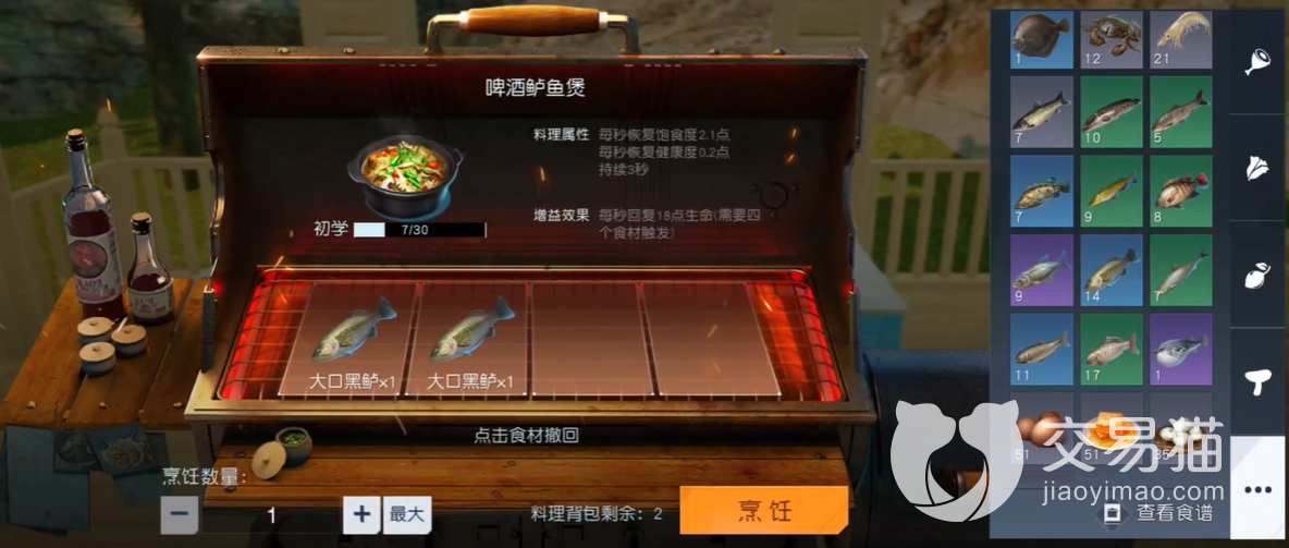 啤酒鲈鱼煲这个配方当中有一个会误导大家的字眼,因为游戏中目前是没有啤酒这个食材的,所以大家不用想办法去获取啤酒,需要准备好的是鲈鱼,大家在会钓鱼的时候就可以获取鲈鱼,一条是不够的,最低需要两条,通过钓鱼准备好两条黑鲈鱼。