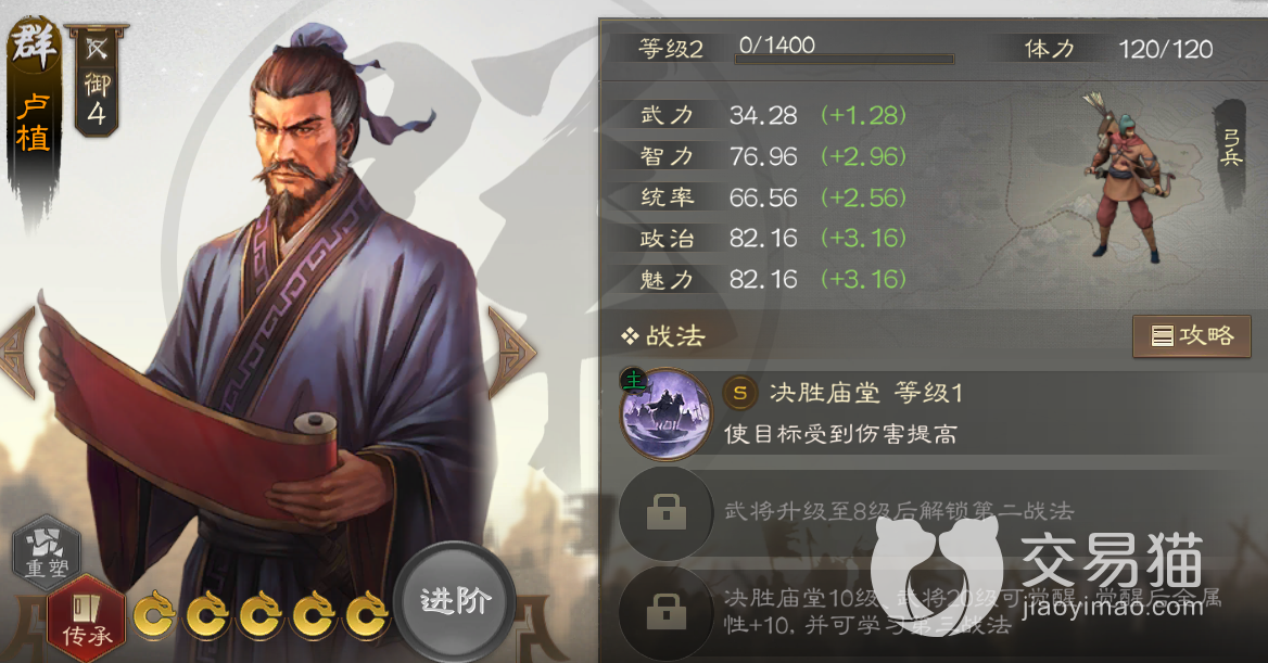 在获取方法上,玩家需要先获得良将朱治然后才能通过传承方式拆解得到此战法,朱治本身其实并不是很适合这个战法,因为它的智力不高,无法很好发挥战法的谋略伤害。因此建议各位先去名将招募的卡池中将其抽出来,然后直接拆解给其他更适合的武将即可。