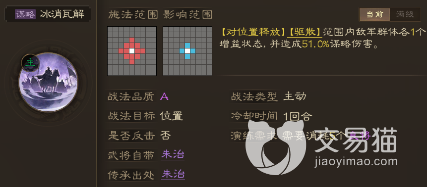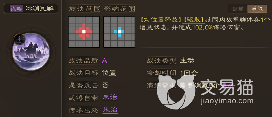 该战法的效果是驱散敌军的一个增益状态,随后造成群体谋略伤害,它的施法半径是自身以外的两格,但影响范围却只有目标周围的一格,所以虽说是AOE技能,但实际影响范围并不算广,不过考虑到它是A级战法,其实也可以接受。然后通过升级它的伤害也可以逐渐提升,初级是51%,满级是102%。
