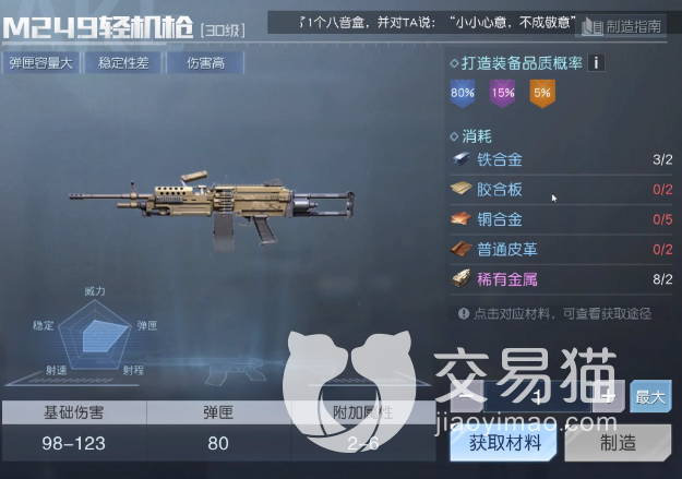 到达了每一个指定等级的时候,武器库就会有新的枪支解锁,大家获取了新的枪支配方之后就可以开始制作了,到达五十级之后也有几把枪支是新解锁的,第一把就是M249,这把枪其实在50级的几把枪中,伤害最低的,虽然在弹药装填上面有优势,但是换弹的时间是一个明显的缺点,其次就是伤害不如其他的几把枪。