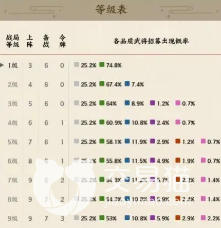 而紫色是稀世武将,那橙色属于绝品类型,粉色的是美人,如果没有达到相应的等级要求,那在等级表也不会出现高品质的武将,等级表分为9级,9级为最高级别,品质武将的出现概率会高。