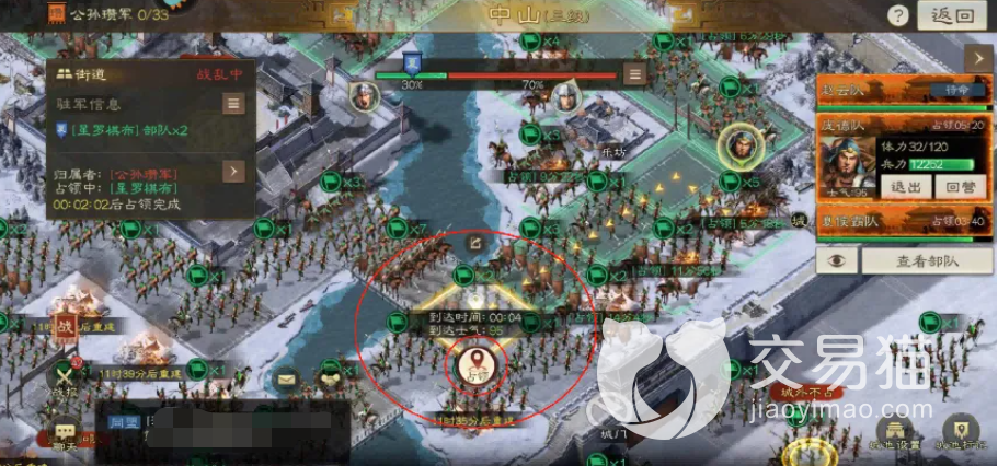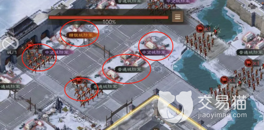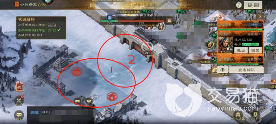 攻克城门的第二步就是连地,具体方法就是将上图圆圈标出的这三个地方给全部占领,其他地方就不要去了,没什么用,而且乱动扣体力扣得严重,有时候实在没办法的话也可以用稍弱一些的二队甚至三队来开路,主力的体力一定要留着后面进攻使用。