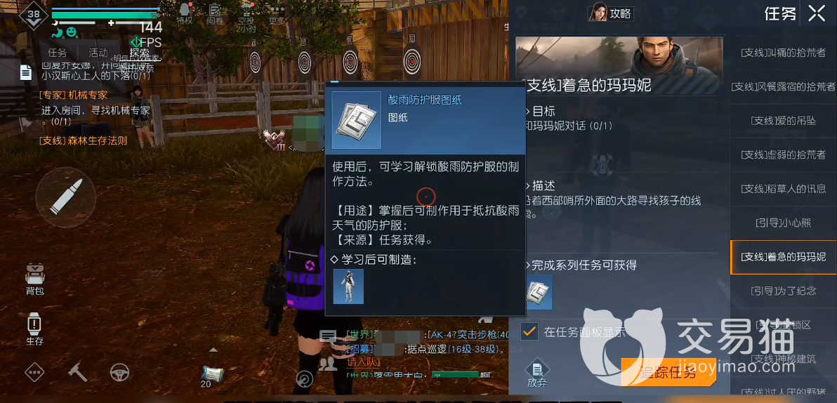 大家获取防护服的途径就是自己制作,但是想要制作的话,首先就要获取防护服的图纸,这个图纸不是随着大家到了50级就自动解锁的,需要大家按照任务来解锁,大家需要去找一个叫做玛玛妮的NPC,这个NPC会告诉大家如何获取。