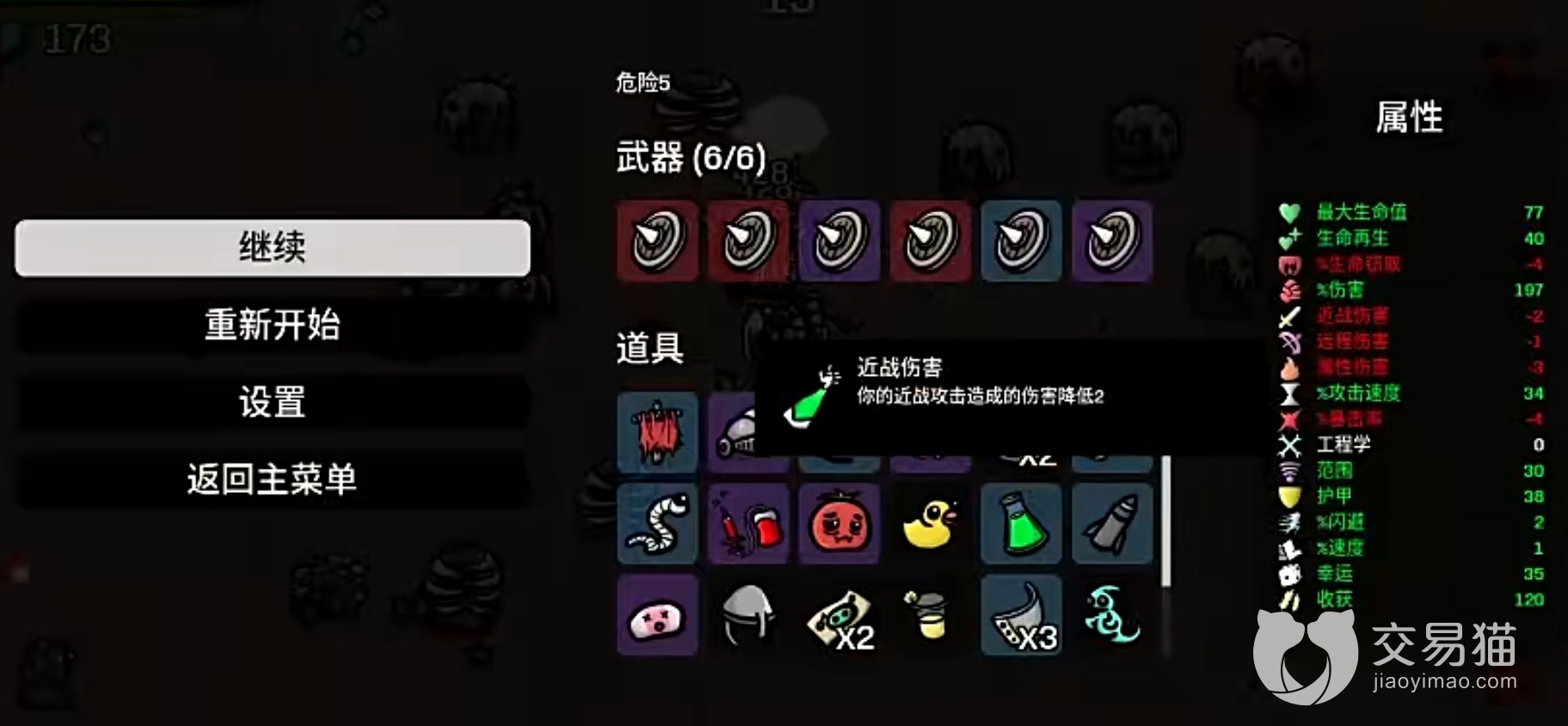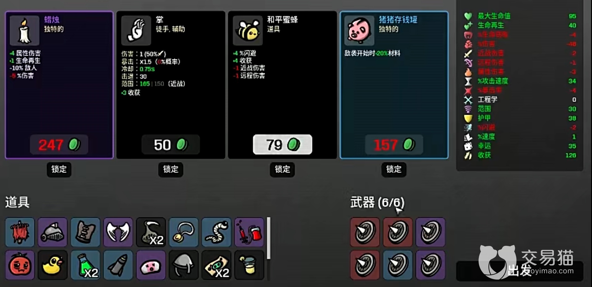 到了中期阶段,玩家可以注重它的属性选择,建议把生命再生、护甲、幸运值和收获值依次拿点,武器方面有尖刺盾的话就拿尖刺盾,没看到尖刺盾那就去选择钝器类,道具要拿“献血”,属性伤害也要点一些,攻速和闪避都是有多余的话就拿,没有就算了,不要强求。