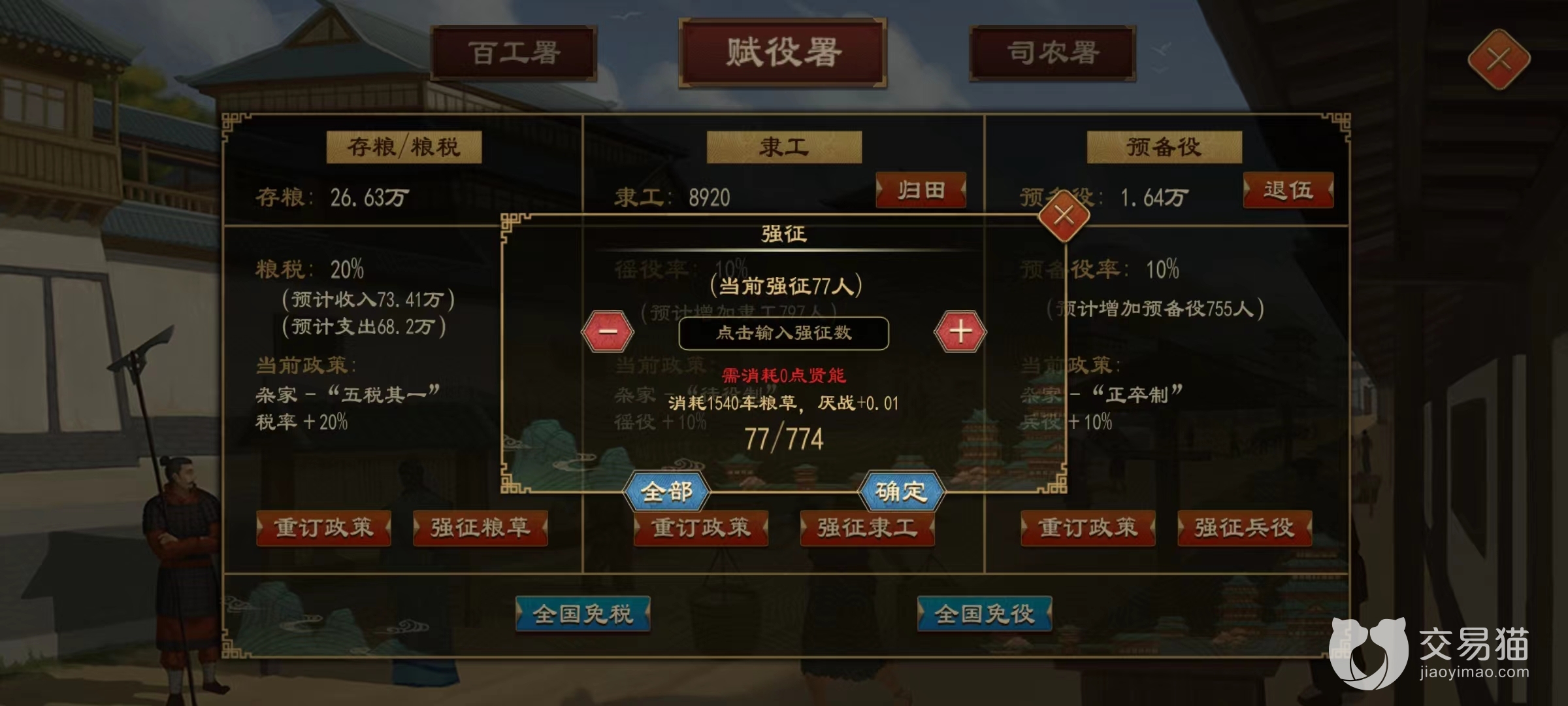 第2种招兵的方法就是强行征召。在普通征召兵力数量不够的情况下,可以选择强行征召这种方法可以有效的缓解兵力短缺的情况,但是会减少大部分的人口,人口恢复的速度极其缓慢,如果玩家不断的使用这种操作的话,国家一定会快速灭亡。