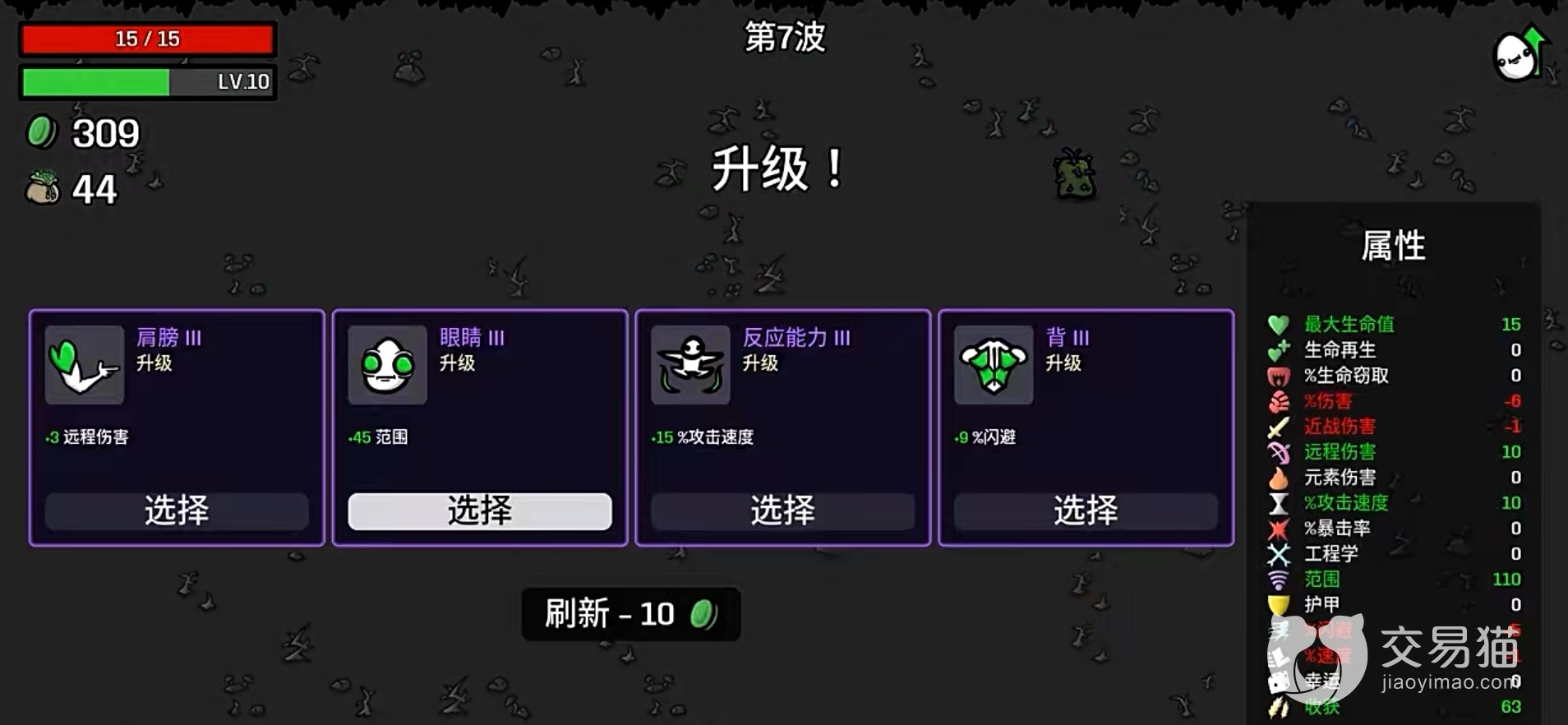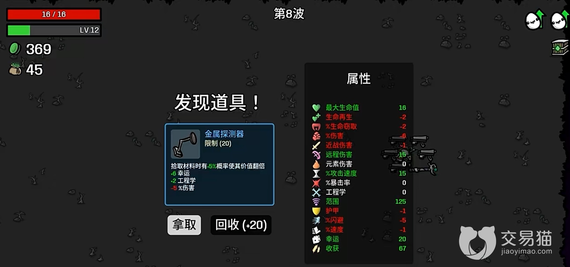 异变体:很适合新手开荒,它的难度5非常好过,前期拿远程伤害、攻速、收获与幸运值,后期叠加暴击与范围,道具方面可以拿点南瓜与头巾即可。