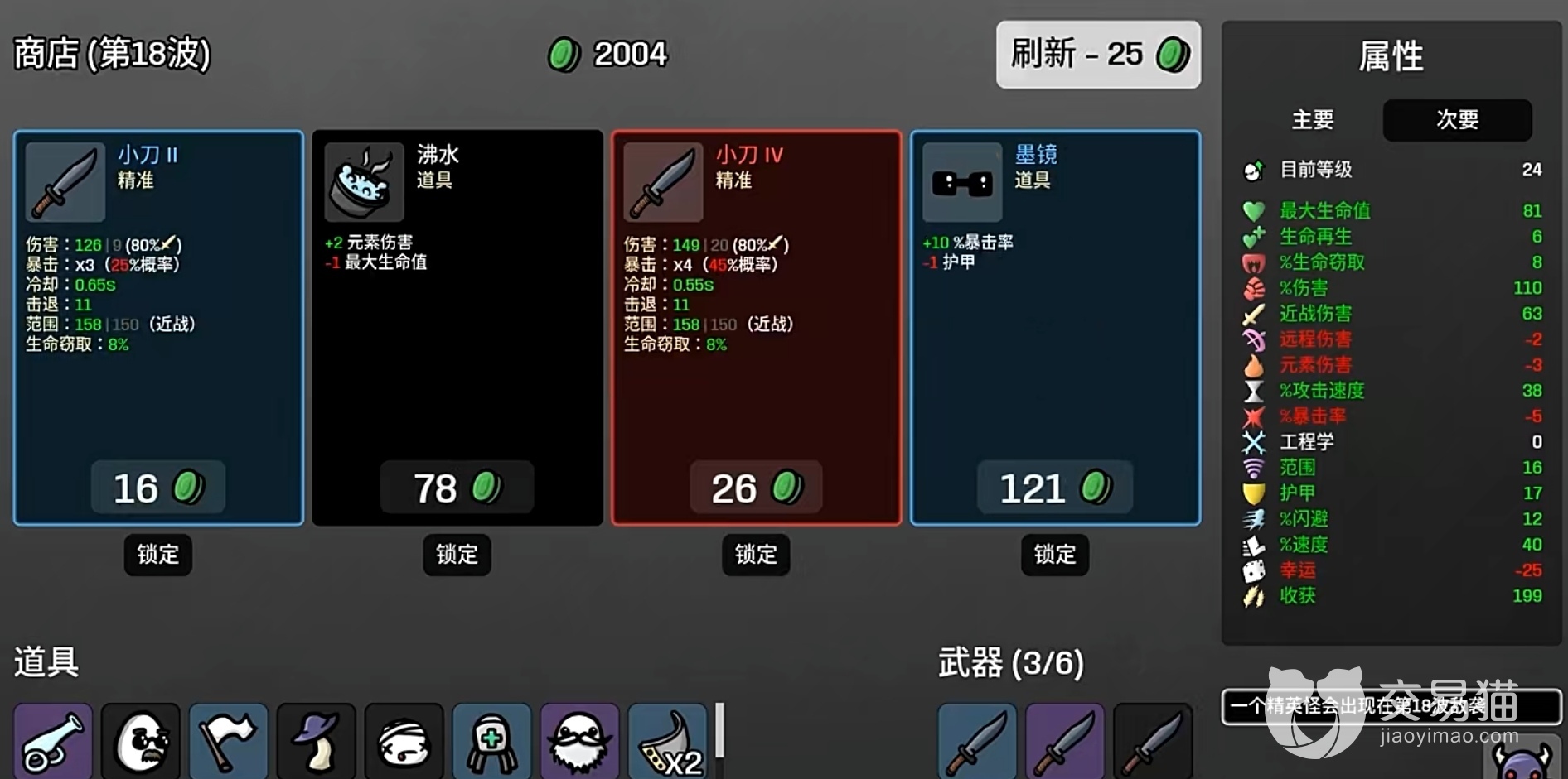 狂人:初始的范围属性不错,不用额外过多地去加成,前中期选择近战伤害,中后期加生命,暴击尽量叠到百分之五十,基本上就能过关,武器方面,小编推荐它使用雷光刀、飞镖与盗贼匕首。