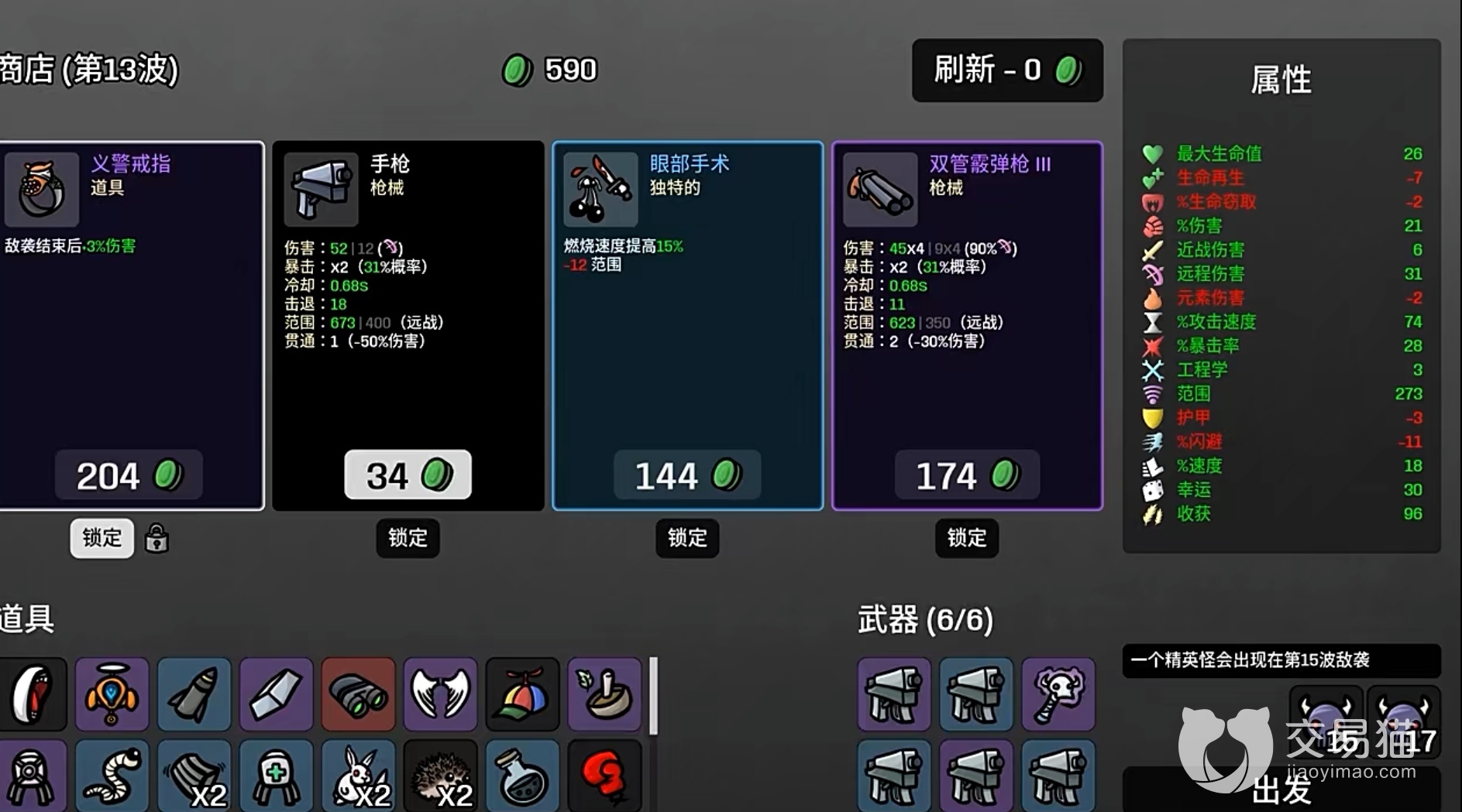 骑士:属性上前期选择护甲、生命再生、最大生命值、百分比伤害、中后期选择适量生命偷取、闪避、速度,尽量避免攻速、暴击、收获,能够轻易的击杀各种小Boss,以及守关Boss,武器就是拿一水的蓝色品质武器即可,比较轻松可以过关。