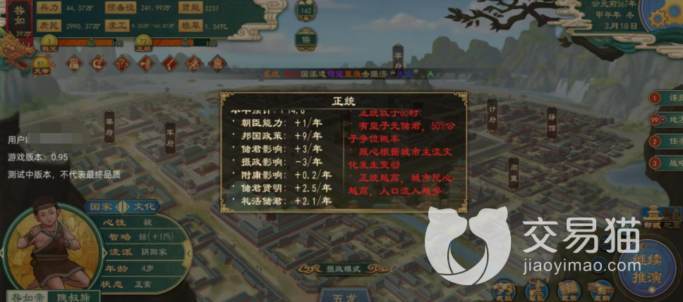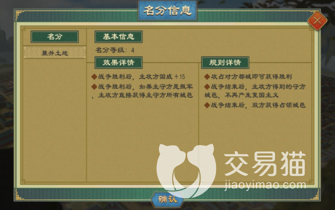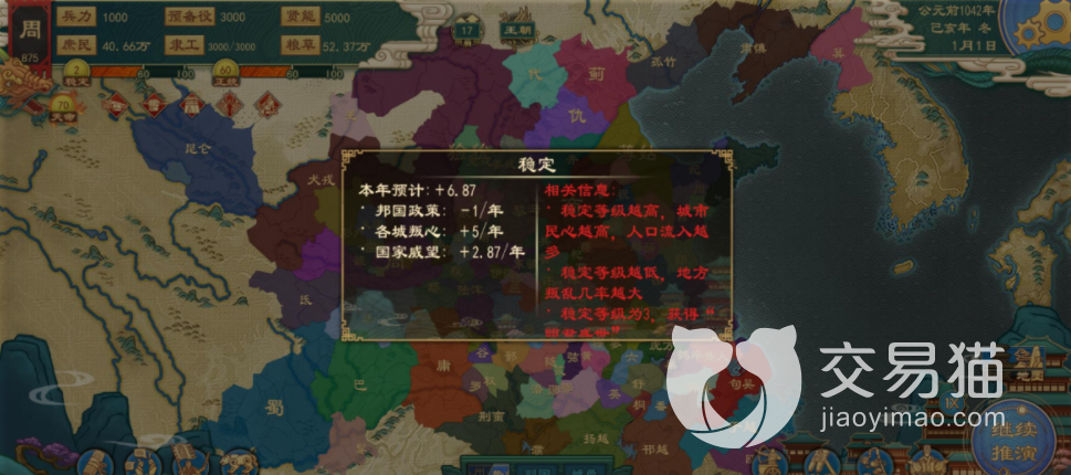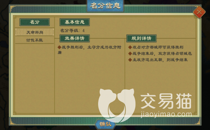 而随着玩家的大一统进程不断推进,天命值也会随着玩家战争的胜利而不断的进行提升。等到一统地图的时候,大家的天命值也会达到满分的样子。