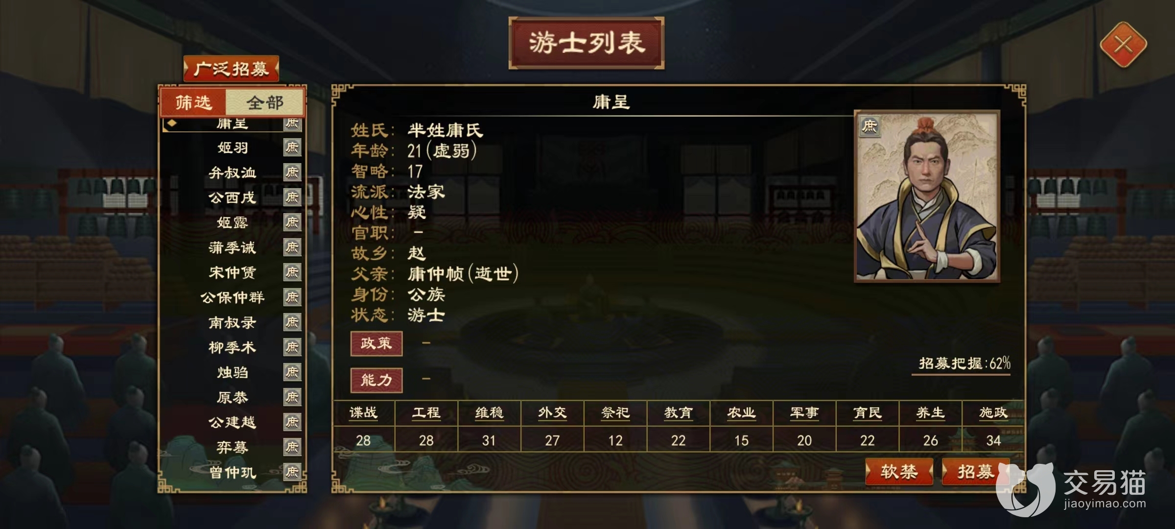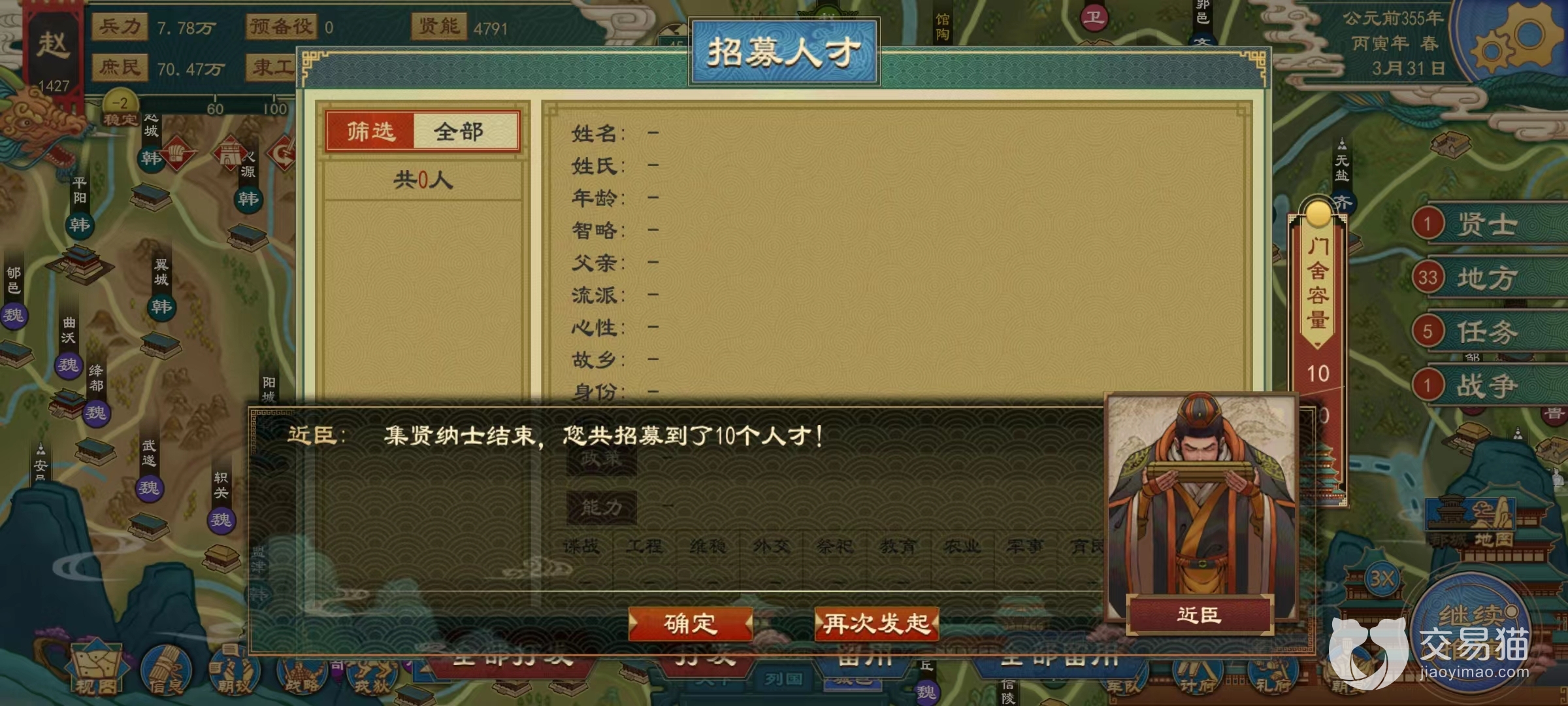 玩家在游戏当中如果想要增加获得的人才数量,就是可以找到目前我们拥有的官员,让他给我们推举人才。属性越高的官员推举上来的人才属性也就会越好,选定了自己喜欢的人才之后,就可以将他们作为客卿留在朝内为玩家分忧了。