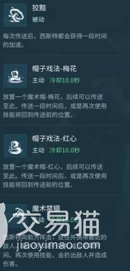 西斯特作为一个以魔术为主的角色,在外形上面自然也是非常神秘的,头上有一个高帽檐的礼貌,技能上也是跟魔术有关,他的两个技能都是主动技能,一个是帽子戏法另外一个是魔术禁锢,帽子戏法使用的时候可以发出位移。