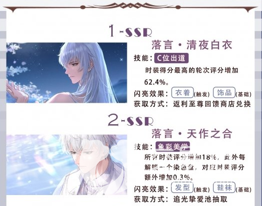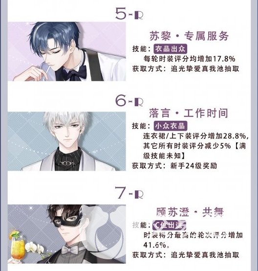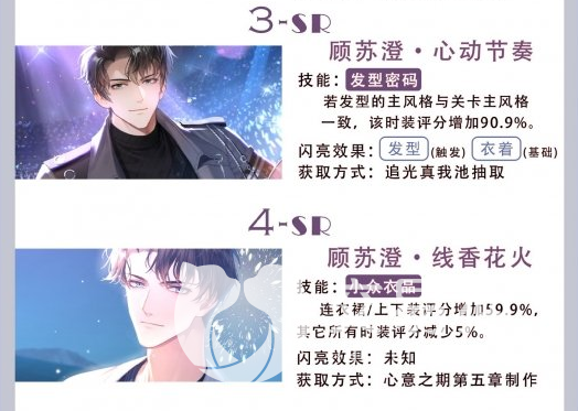 SR级别的卡牌是多数玩家都能撸来的卡牌,属于游戏中的次强卡牌且都属于顾苏澄。第一个为心动节奏,技能发型密码是发型风格和关卡主题一样时,时装评分能增加90个点,在特定情况下,时装环节得分有极小概率会超过SSR级别的卡。第二个为线香花火,技能小众衣品是把双刃剑,能将上下装和连衣裙评分拔高接近六十个点,但是其负面效果是其他时装评分下降五个点,不到特定主题关卡可以不用。