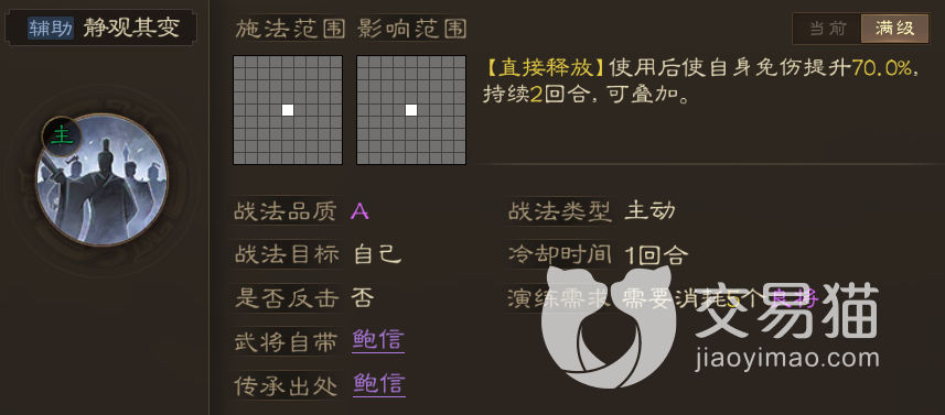 静观其变:十分bug的一个防御型战法,目前已经被削弱,之前是提供三回合的70%免伤,虽然现在砍到了两回合,但数值至少没变,所以在A级这个序列中它还是十分强悍的,特别是搭配一些本来就肉的武将,敌人更加打不动他。