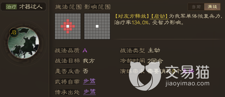 才器过人:升到满级,使用后可直接按134%的治疗率来恢复单体友军兵力,这个治疗系数还是不错的,而且因为是启动技,所以使用后还可再次行动,多带几个A级治疗战法,单回合内也能起到有效的续航保障。