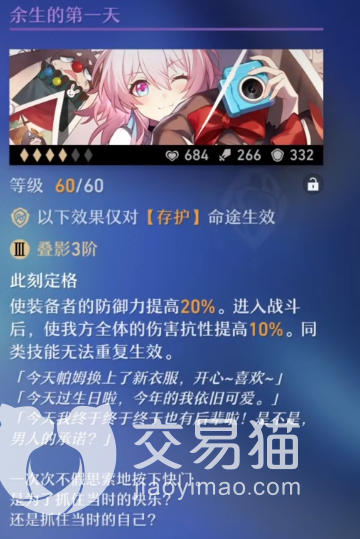 “余生的每一天”它可以最大程度地提高三月七的防御能力,同时还能提高整个团队的抗伤性,是最能满足她需要的光锥,可以说是这个角色的本命光锥了,推荐指数为四颗星。