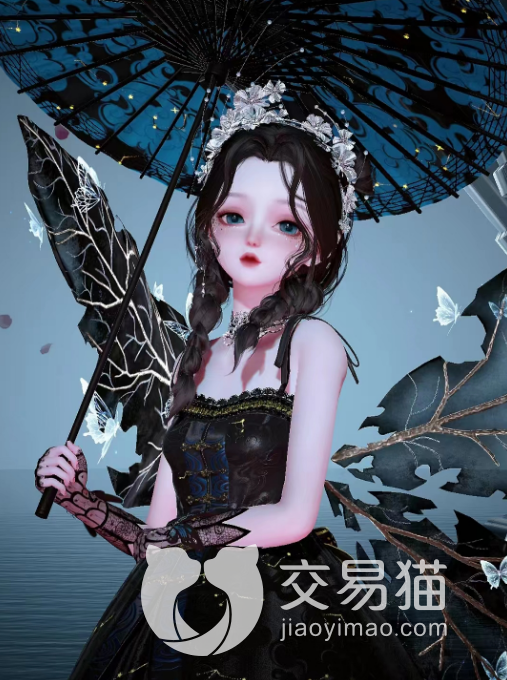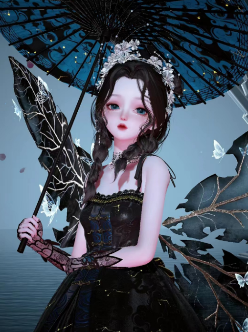 列宿藏星的设计感非常强,门襟采用的是深蓝色的云纹,裙边则是三层蕾丝花边叠加,再点缀上宝石和星星,整体来看非常闪耀,仿佛将银河穿在了身上,而与列宿藏星时装配套的还有一把复古的油纸伞,简约而不失科技,非常漂亮!